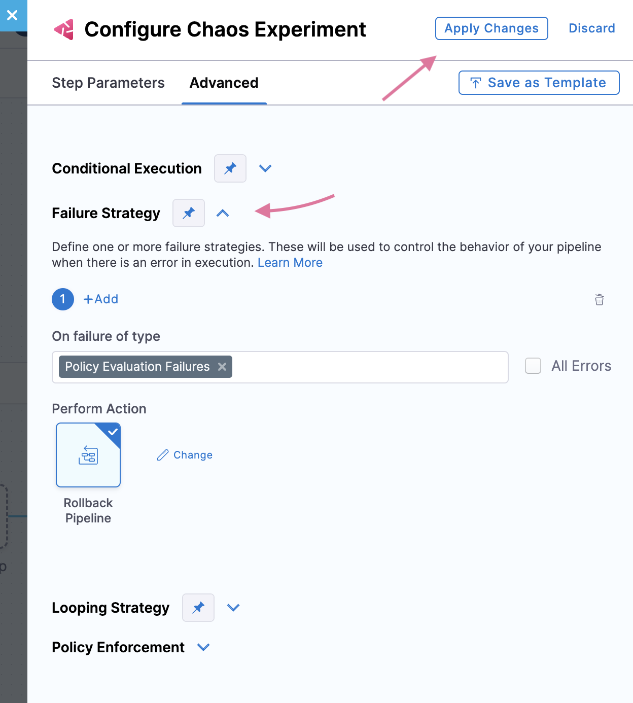 The OPA template contains a failure strategy field which is mandatory, that is, To apply a failure strategy in the template, go to Continuous Integration module, select your pipeline and the step where chaos is used. Go to Advanced modal. Click Failure Strategy and select the strategy. Click Apply Changes.