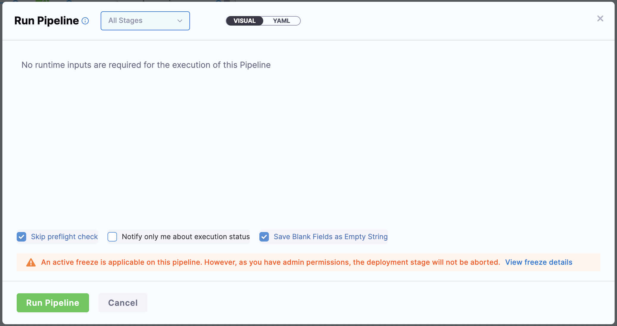 You will now see an alert message when an account admin or a user with freeze override permissions triggers a pipeline during a freeze window.