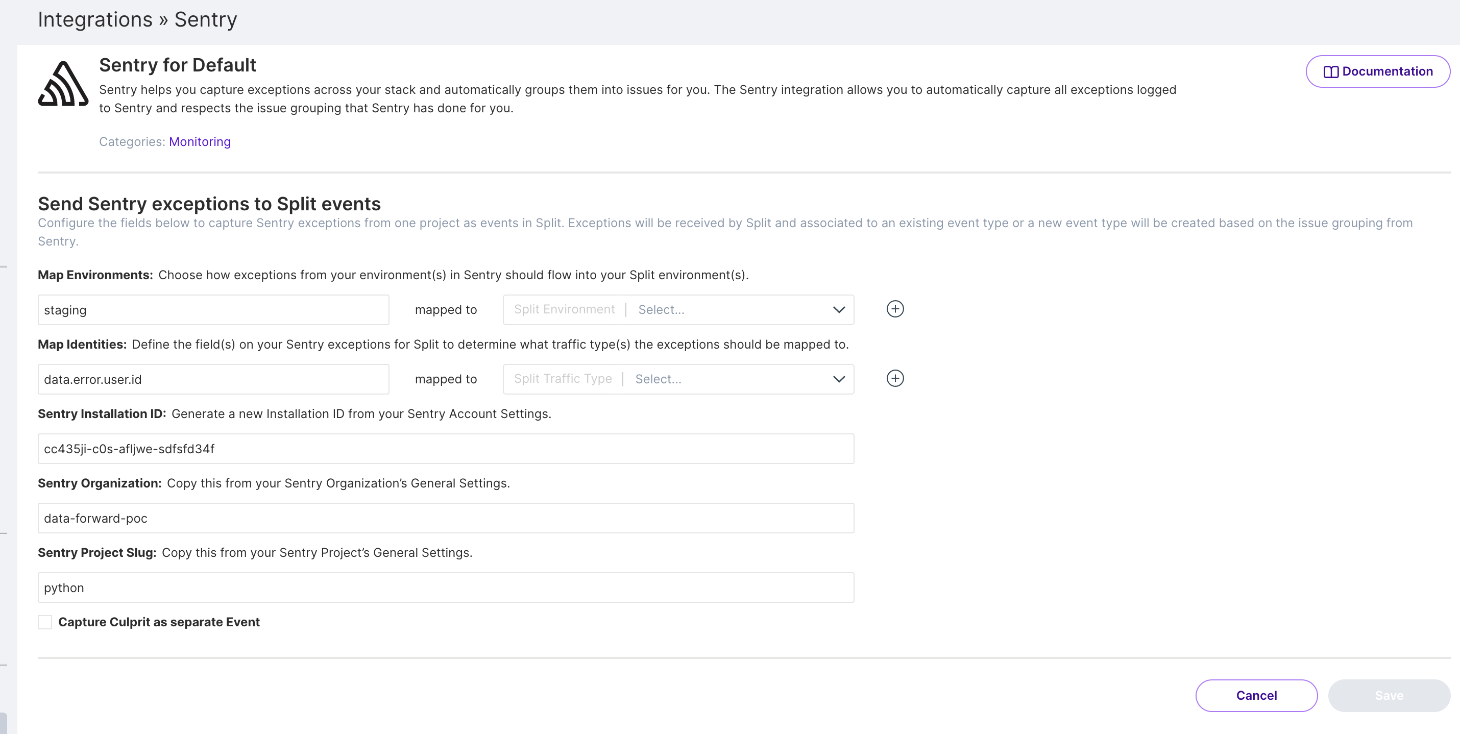 4. Configure the Sentry integration as follows: