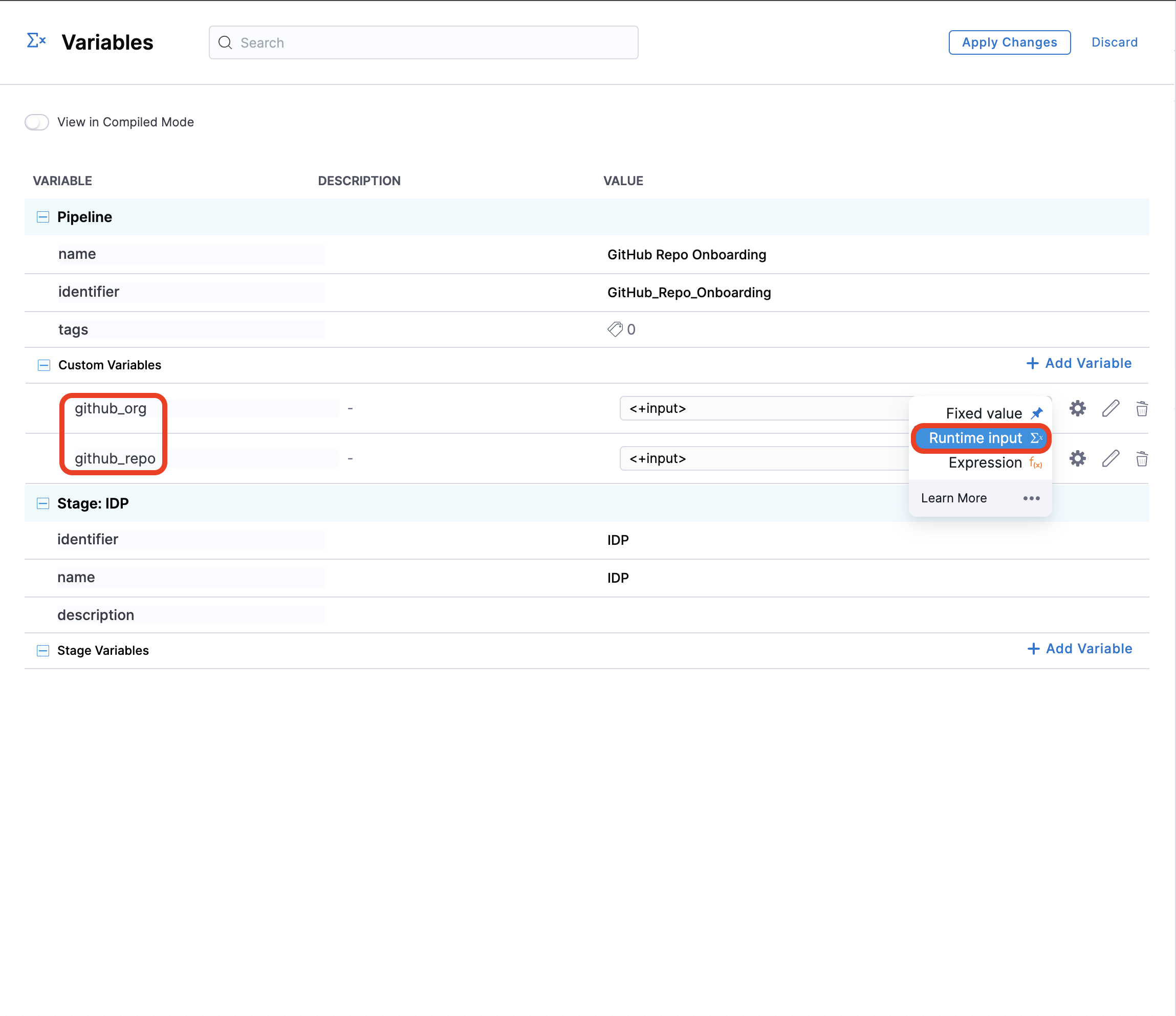 Before adding the execution steps, we need to create some pipeline variables with runtime inputs, which will be used as expression inputs in various steps during execution.
