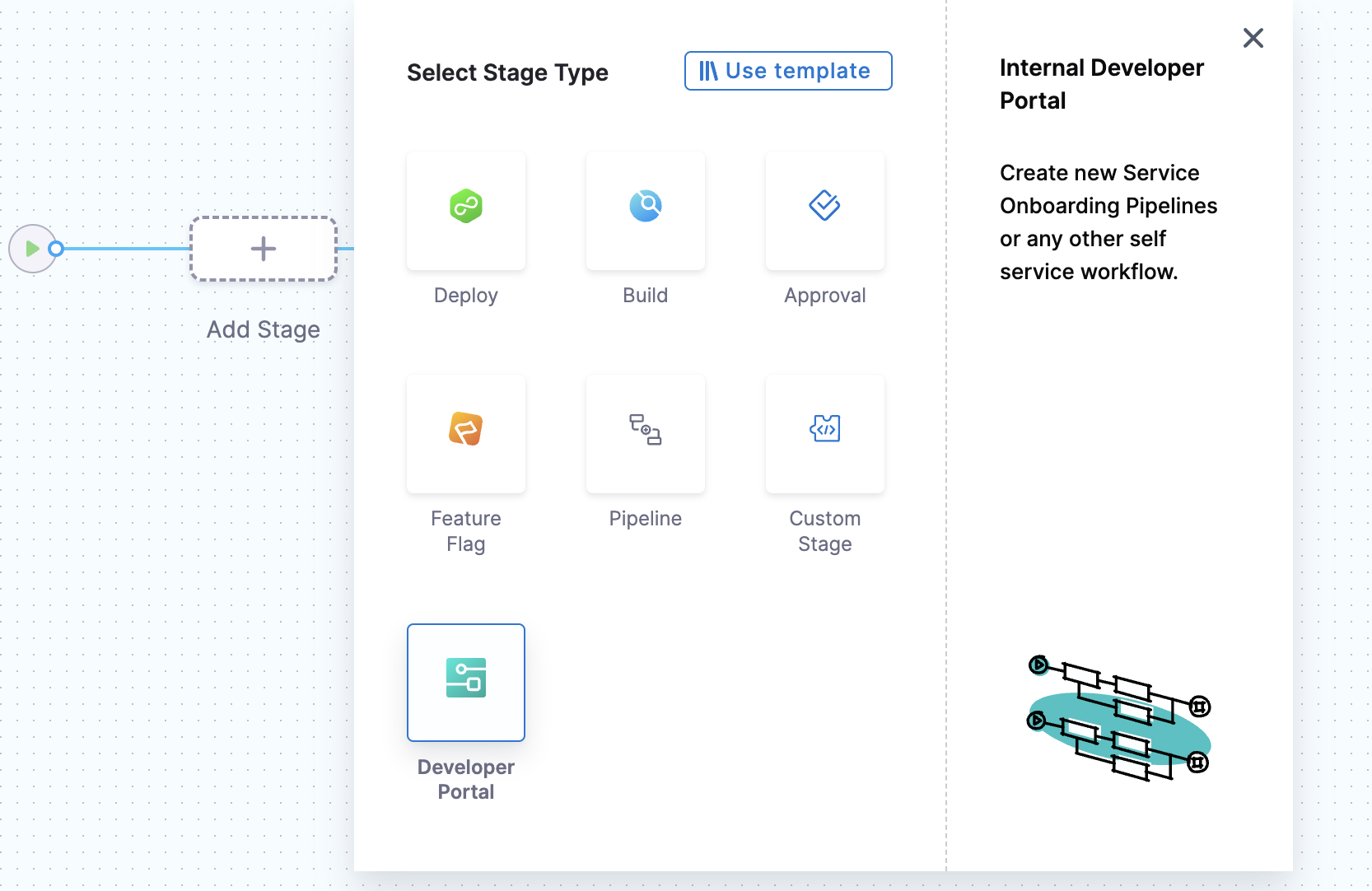 Harness IDP includes a native IDP Stage where all IDP-specific tasks required for pipeline execution are pre-configured as pipeline steps within the stage. This enables quick and efficient creation of self-service workflows.