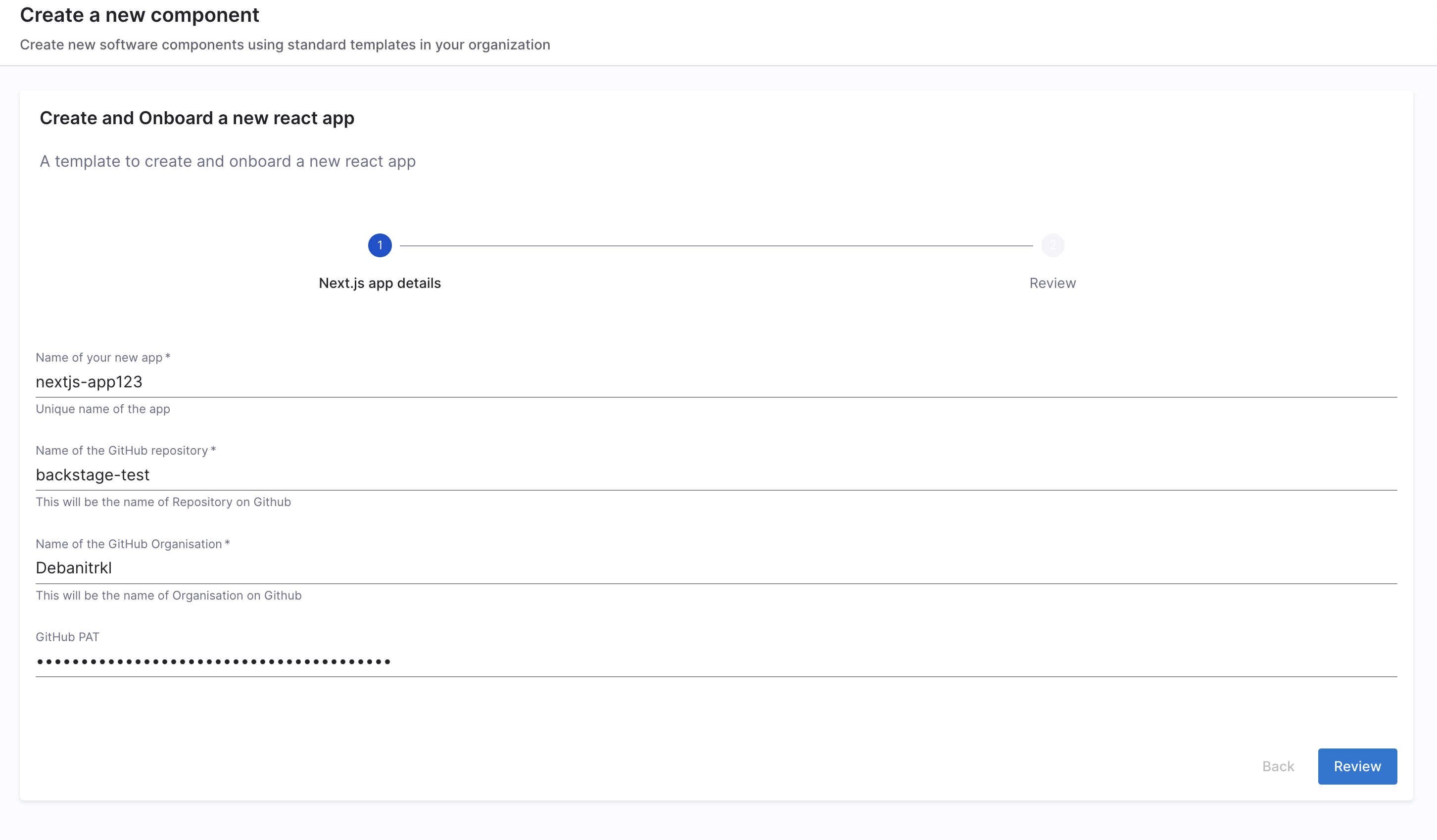 ). If you recall, they are the pipeline variables that we set as runtime inputs earlier. This is what we want the developer to enter when creating their new application.
