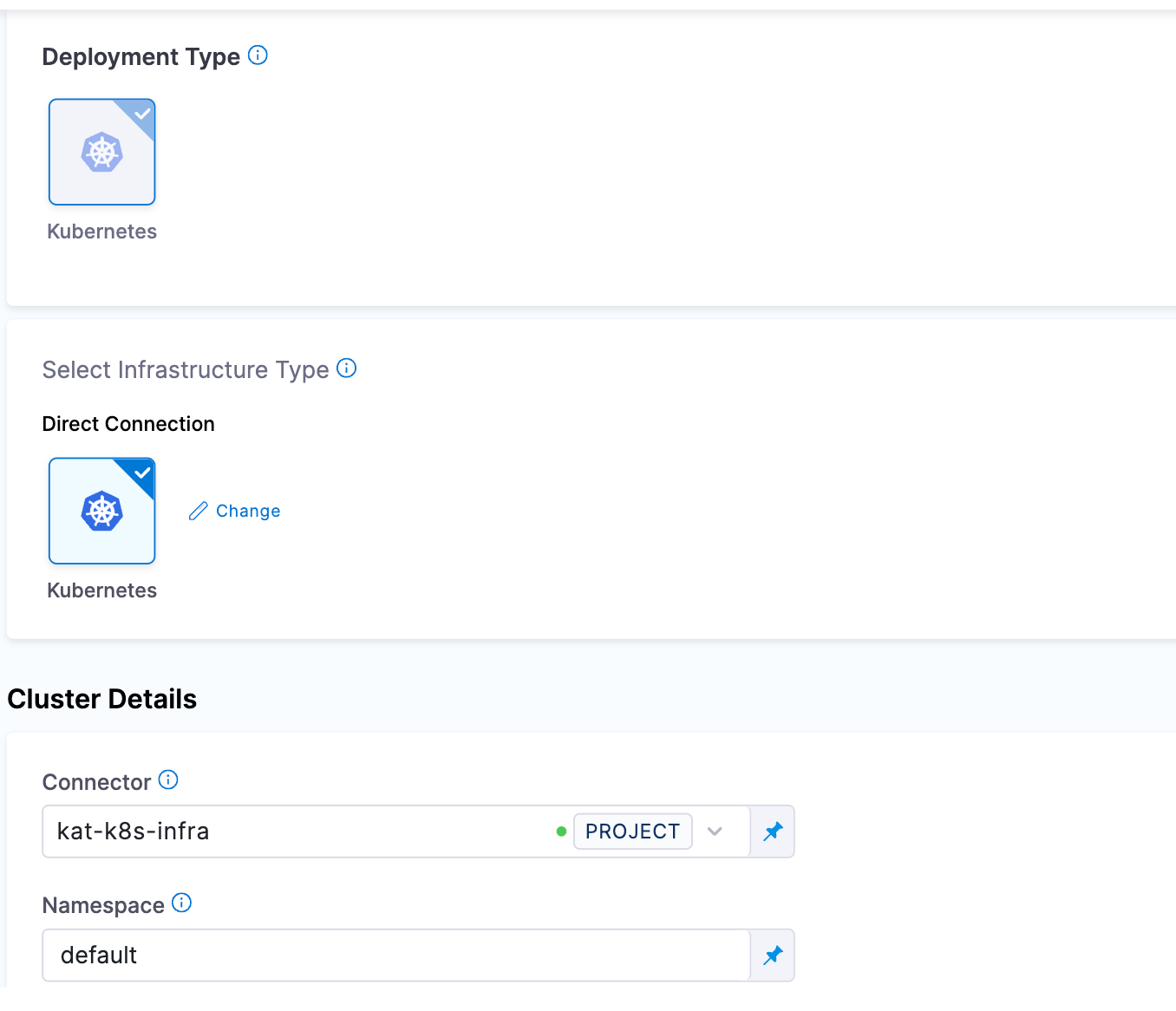 For example, in the Infrastructure section of a stage, there is a Connector setting. For Harness CD, this is the connector to the target infrastructure. For Harness CI, this is the connector to the build farm.