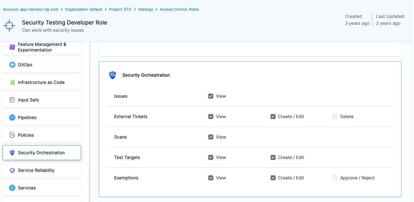 Harness includes two built-in roles specifically designed for STO use cases. Security Testing Developer and Security Testing AppSec. These roles come pre-configured with sets of permissions on STO resources to match typical developer and security team responsibilities.