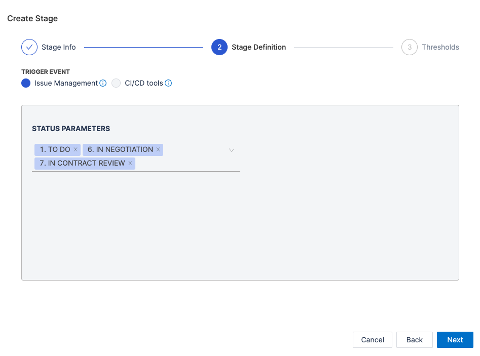 - Define the Stage Trigger Event (e.g., Issue Management) and map the stage to statuses in your issue management system.