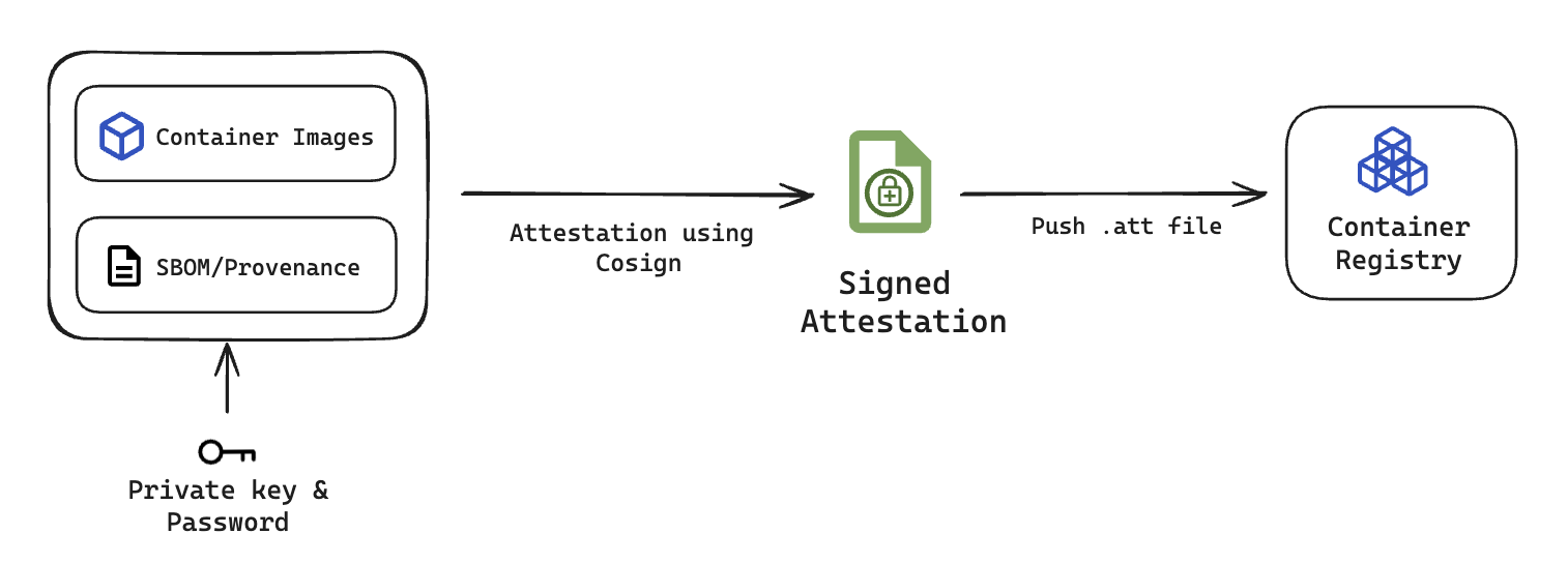 Attestation provides cryptographic proof of an artifact’s origin based on how and where it was created. It captures metadata about the build environment and verifies the artifact’s integrity before it is signed. Attestation serves as a trusted statement regarding the artifact’s provenance and the conditions under which it was produced.