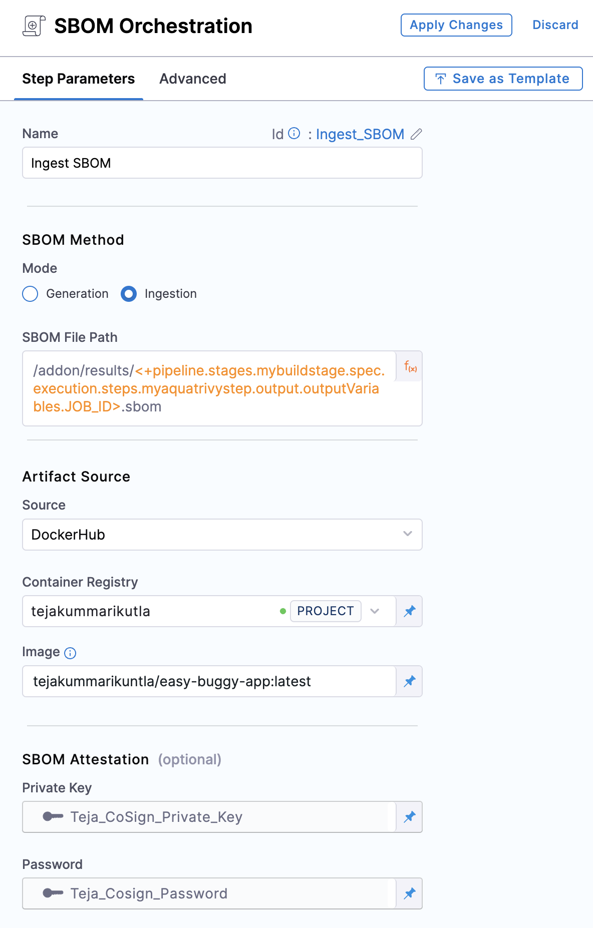 For enhanced trust and verification of your SBOM's integrity, the SBOM Orchestration step offers optional signing and attestation generation feature. This functionality requires a private key, password for attestation and corresponding public key for attestation verification. If you choose to skip the SBOM attestation, you can proceed without generating the and storing these keys.